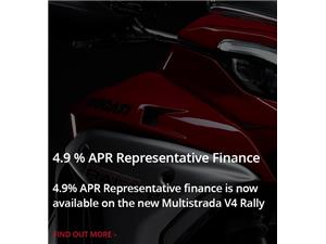4.9% APR Representative finance now on the Multistrada V4 Rally from £219 per month plus deposit and optional final repayment.