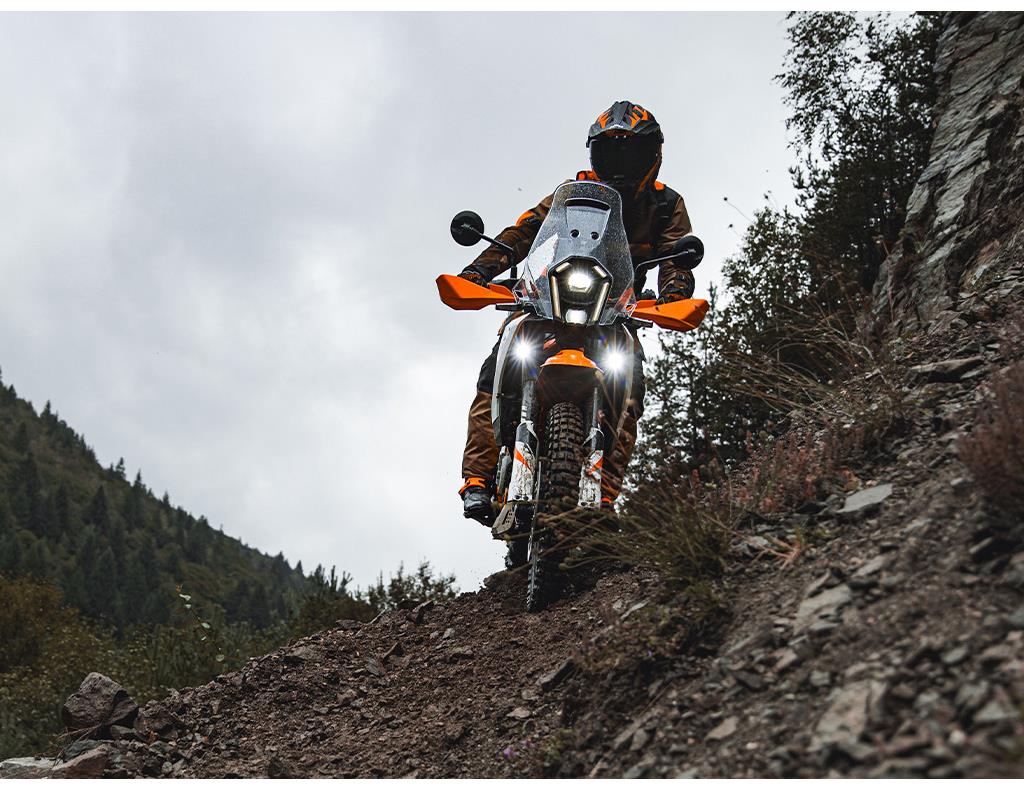 You'll no doubt hit some highways at some stage. Good thing, then, that the KTM 390 ADVENTURE range boasts a sturdy and efficient windshield. Thanks to its slim profile, the rider isn't obstructed when moving around the machine. It also offers an unobstructed view directly in front of the bike - even when covered in dirt.