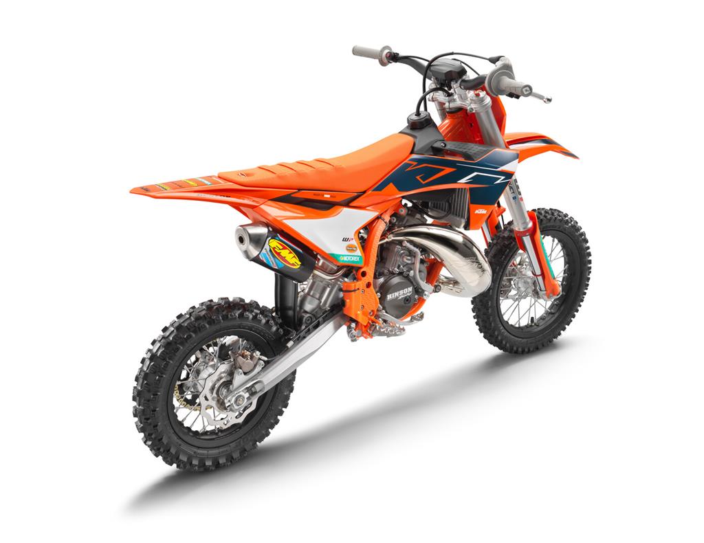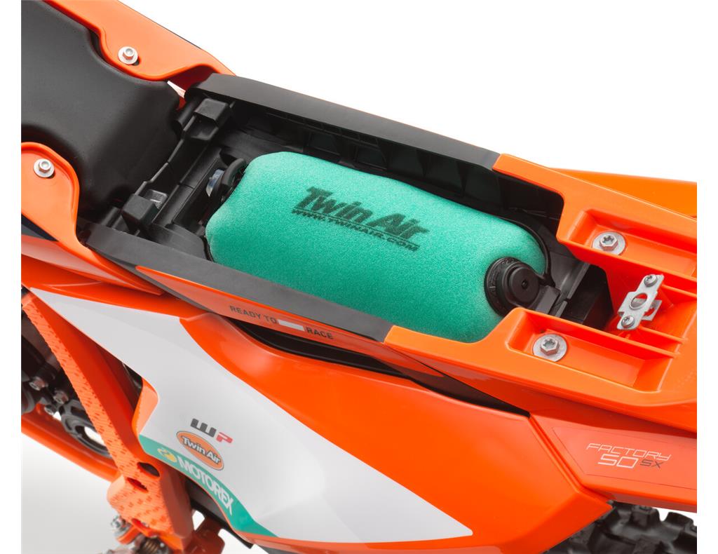 The KTM 50 SX FACTORY EDITION features a modern and compact engine using the latest 2-stroke technology. Using a 3-shaft design, the crankshaft is positioned near the center of gravity, which benefits mass centralization and creates the ideal intake angle into the reed valve for top-level performance. An independent cylinder blank allows for a complete cylinder design, with increased power.