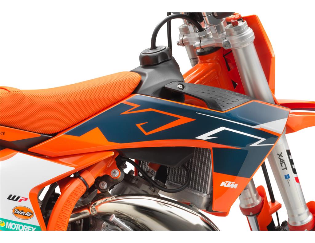 The KTM 50 SX FACTORY EDITION has state-of-the-art Pankl radiators inspired by the full-size KTM SX range and features the same basic design with all the hardcore cooling properties. The KTM 50 SX FACTORY EDITION uses one large radiator with more capacity instead of two smaller separate ones. This concept allows for better integration of the radiator into the frame and the tank spoilers to channel air through the cooling fins efficiently.