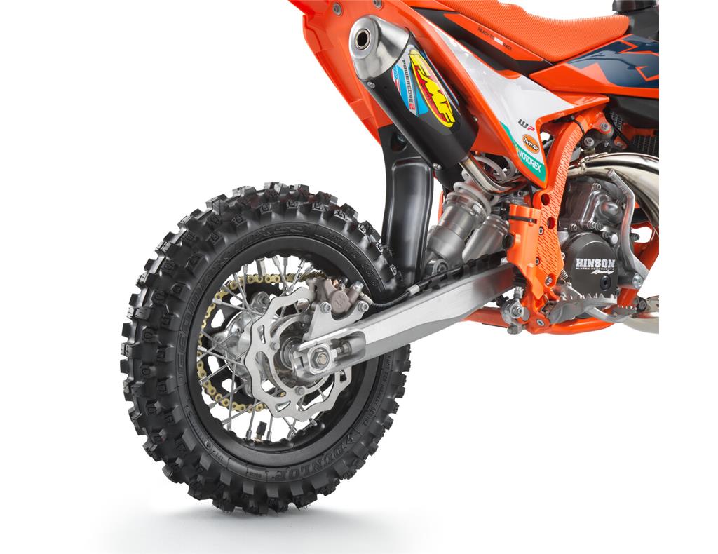 Rolling off the race rig and into the pit lane, the KTM 50 SX FACTORY EDITION uses lightweight, black anodized, aluminum rims like the full-size KTM SX range. These provide the highest levels of strength and reliability; DUNLOP Geomax MX53 tires deliver outstanding performance on any terrain and exceptional straight-line stability.