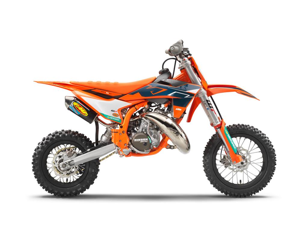 The KTM 50 SX FACTORY EDITION shines with KTM Red Bull Factory Racing-inspired colors, and much of the bodywork is finished in orange with blue accents - like those found on the full-size KTM Factory Editions. Of course, sponsor logos, gray ODI lock-on grips, and an orange factory seat rounds off the package, making this 50cc weapon look as fast as it gets off the line.