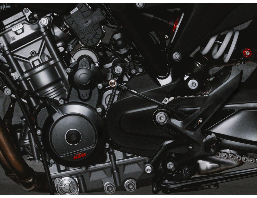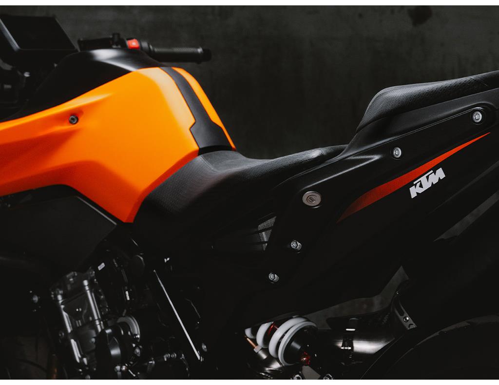 Configurable with up to 5 different ride modes, the KTM 790 DUKE is ready to dominate just about any eventuality. In the default STREET setting, riders have full power, traction control, and limited front wheel lift, with easy throttle response. SPORT steps the experience up with sharper throttle control and some wheel slip, while RAIN mode does what it says on the box, providing maximum traction and reduced power in wet conditions. The optional PERFORMANCE and TRACK Modes crank the KTM 790 DUKE all the way to 11, providing enhanced rider customization and focused sport riding.