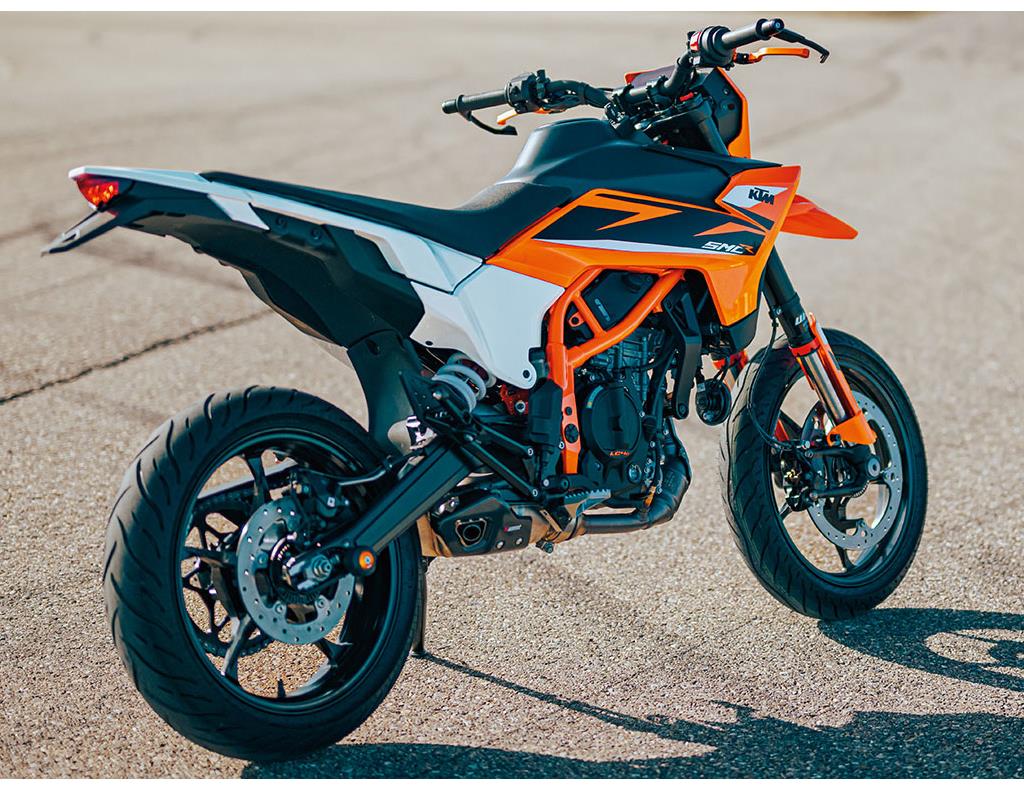 " />With an ergo triangle inspired by its trusted and beloved 690 sibling, the KTM 125 SMC R boasts aggressive bodywork and a compact 9L metal fuel tank that is perfectly styled to allow for easy put-out, knee-down action. The bodywork is also made from proven, flexible, and long-lasting PP plastic material better suited for off-roading and aggressive riding.