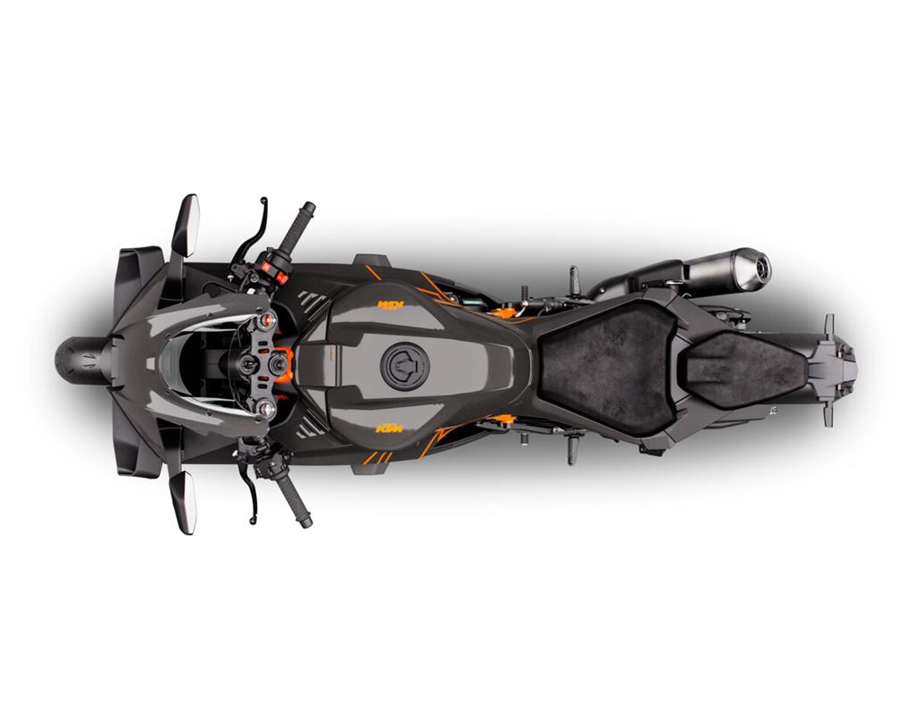 The EU 5+, 947 cc, parallel twin LC8c has been harnessed even further thanks to a tweaked engine map and 100% full throttle opening position to suit the needs of the KTM 990 RC R and the most compact twin in the segment. The impressive stats come in at 130 PS (94 kW) and 103 Nm of torque at 6.750 rpm. A new stainless steel, centralized exhaust muffler also helps to urge the whole show to gobble straights and slice corners.